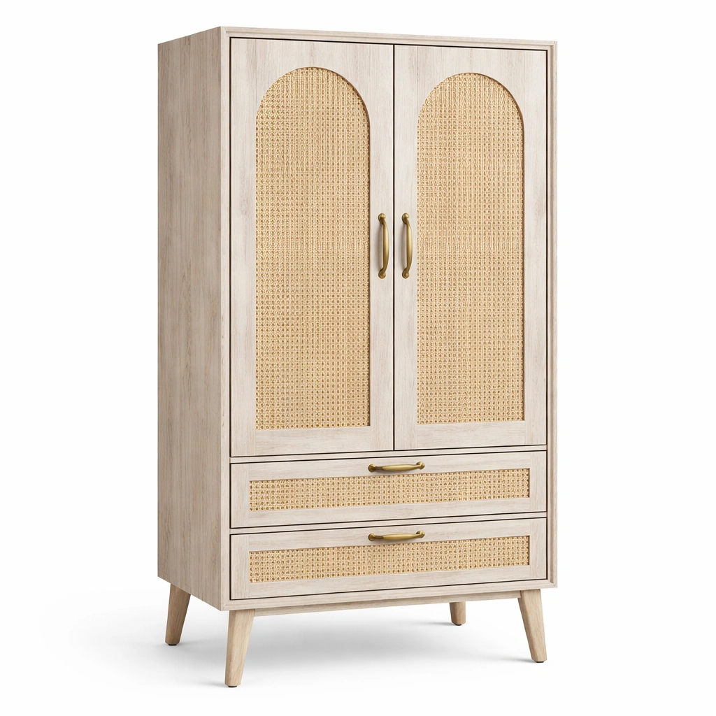 Armario de madera de pino y ratán con 2 puertas y 2 cajones