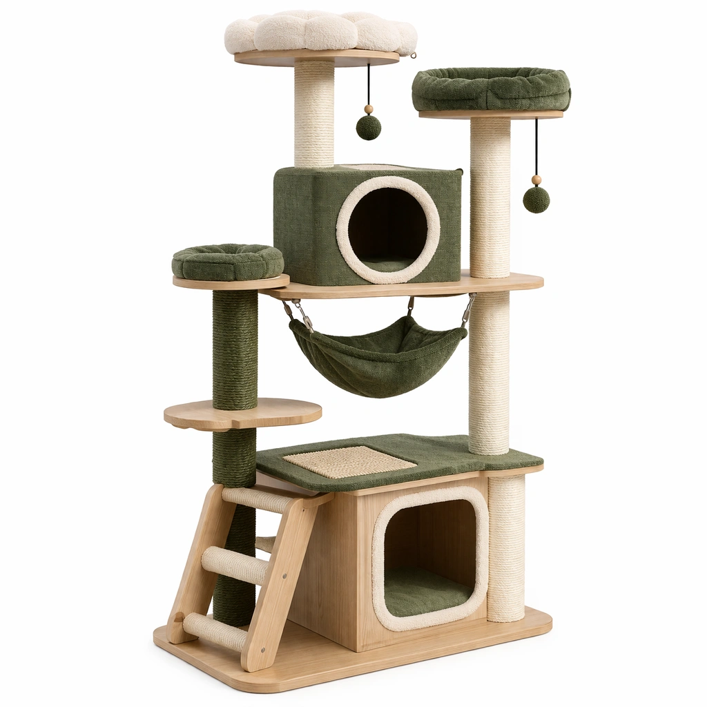 Estructura: Base estable, múltiples plataformas, cuevas acolchadas, hamaca colgante